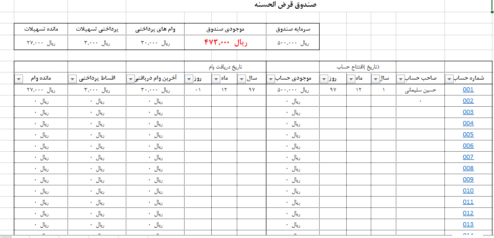 برنامه کاربردی اکسل مدیریت حساب های صندوق قرض الحسنه...این برنامه تحت اکسل توشته شده وبه راحتی می توانید تا 50 حساب را مدیریت کنید و گزارش و اطلاعات صندوق را به صورت خودکار دریافت نمایید.